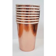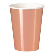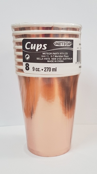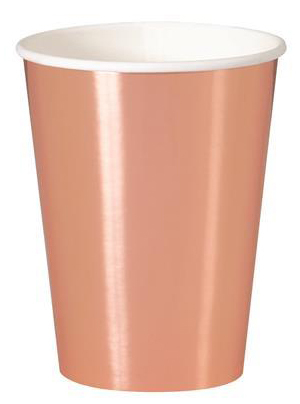 8 x Rose Gold 9oz Foil Cups perfectly matched in with our other Rose Gold party items. Cups are made from paper with a foil reflective outside. These cups are white on the inside and have a white top edge. Measuring 8cm Top Diameter, 5.5cm bottom diameter and a total height of 9.5cm and can hold 9oz or 270ml of liquid. Cups cannot me placed in the microwave due to their foil outer.