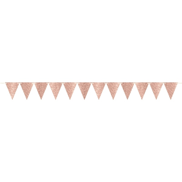 Pack of 12 rose gold glittered pennant flags to create a banner - perfect for heaps of different occasions! Each of the 12 flags measures approx. 22cm across the top x 26cm from top to bottom and they are pre-hole punched (1 piece of 6.09m rose gold ribbon is included in the pack, however the flags are not already threaded on to the ribbon in the pack.) Flags are only glittered on one side; the other side is plain.