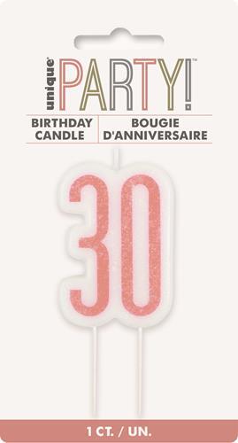 Rose gold glittery #30 cake candle - perfect for a birthday party! Candle measures approx. 4cm x 7cm (1cm in thickness), not including the spikes on the bottom. Spikes measure approx. 2cm in length. Colours/design may vary from image.