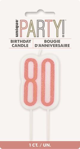 Rose gold glittery #80 cake candle - perfect for a birthday party! Candle measures approx. 4cm x 7cm (1cm in thickness), not including the spikes on the bottom. Spikes measure approx. 2cm in length. Colours/design may vary from image.