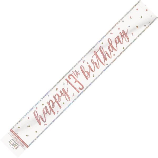 Featuring a white background and sparkling 'Happy 13th Birthday ' wording that repeats 3 times, the banner measures approx. 2.74 metres long x 12.5cm wide.