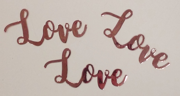Metallic rose gold 'Love' script writing jumbo confetti. Perfect for table scatters, party favours, bonbonnieres and gift tags, place setting messages and scrap booking. Individual confetti messages measure approx. 7.5cm x 3.5cm. 20 pieces of confetti per pack.
