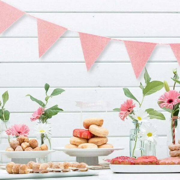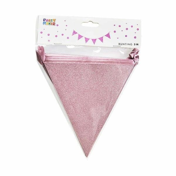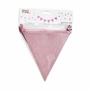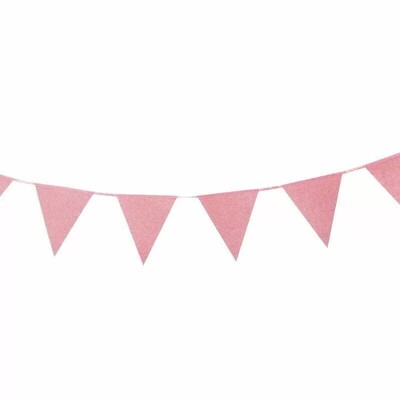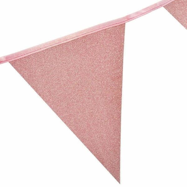 There are a total of 12 individual triangular cardboard pennants with double-sided rose gold/pink glitter finish, each measuring approx. 15cm (w) x 18cm (h), attached to matching ribbon for a total banner length of approx. 3.5 metres.