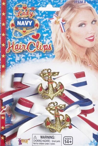 These clips feature a large red, blue & white bow with a smaller white bow overlay and a metallic gold anchor embellishment.