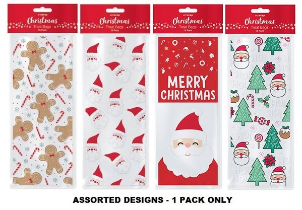 Each pack contains 15 clear cello bags with cute Christmas themed designs - gingerbread cookies & candy canes or Santa face - 1 design per pack.