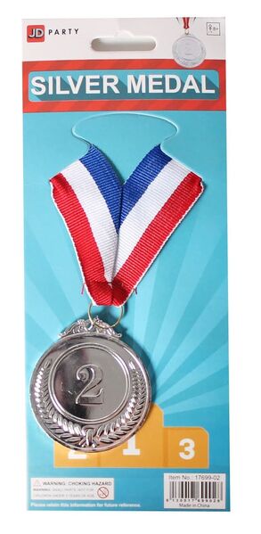 Featuring a silver painted metal medallion printed with the number '2' on a blue, red & white ribbon measuring approx. 80cm long, it is perfect to give as an award or to use as a fun prop for your photo booth.