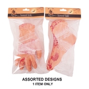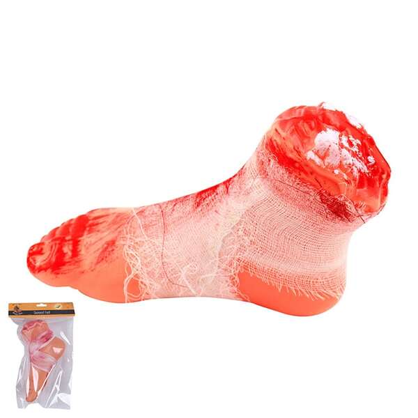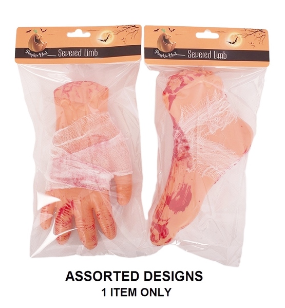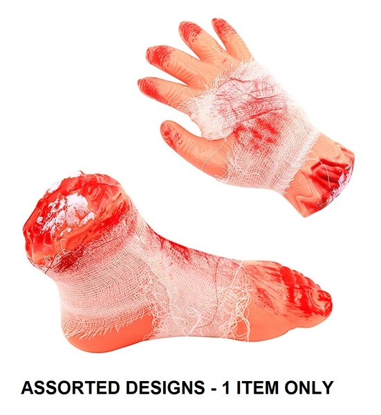 This creepy decoration features a hollow plastic human foot or hand severed at the ankle or wrist to reveal the bone and muscle. The limb is wrapped in gauze bandage and is accented with fake blood smears all over - a truly ghastly addition to your Halloween decor.