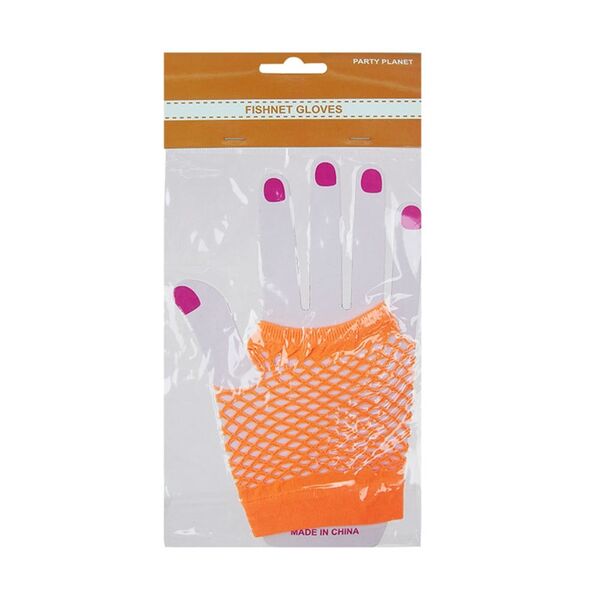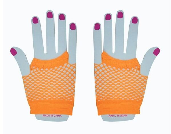 These gloves are made from synthetic orange fishnet fabric and will stretch to fit most adults.