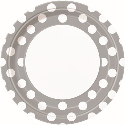Pack of 8 silver paper plates with white polka dots, each measuring approx. 22cm in diameter.