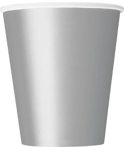 Pack of 14 silver paper cups, perfect for any occasion! Cups are each able to hold approx. 9oz. (270ml) of liquid. Cups are white on the inside.