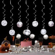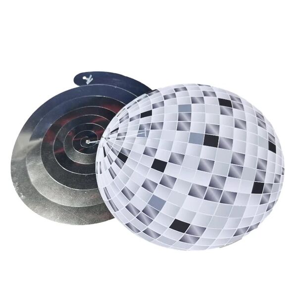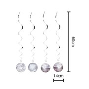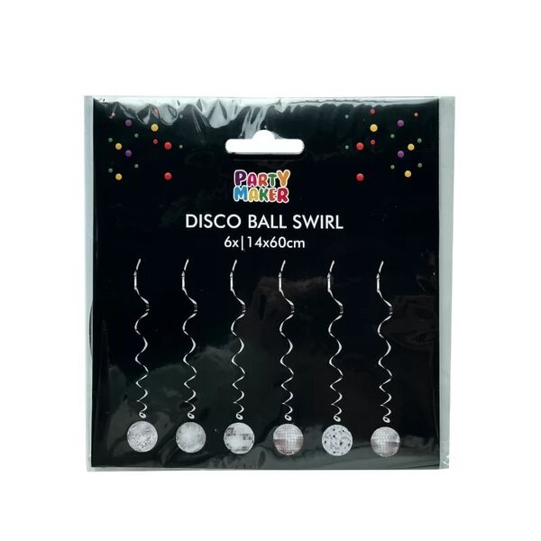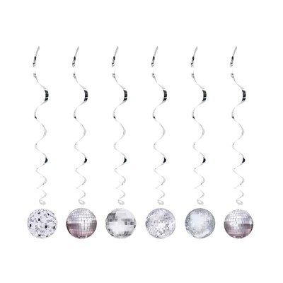 The pack contains 4 plastic swirls decorations - a silver plastic swirl with an attached double-sided cardboard disco ball cutout at the bottom.