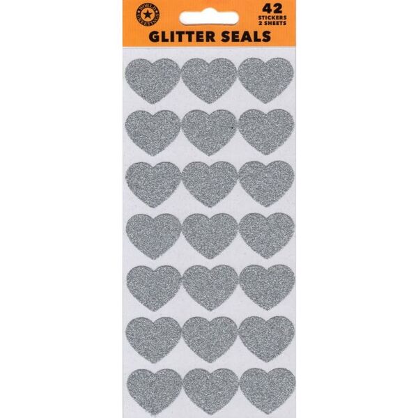 42 silver glitter hearts seals, perfect for decorating gift bags or for sealing envelopes. Each seal measures approx. 3cm x 2.5cm.