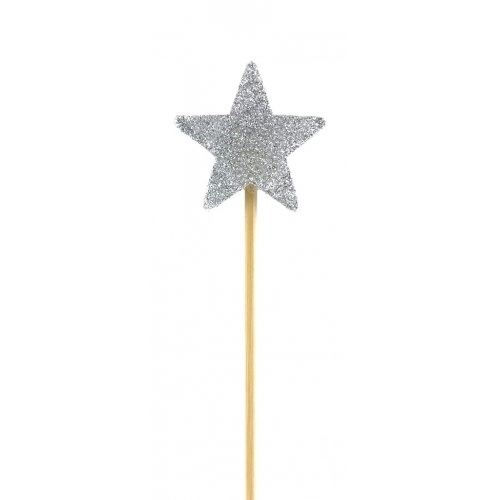 Silver glitter star pick cake candle, measures approx. 19cm in total length (star on top measures approx. 4cm x 4cm.)