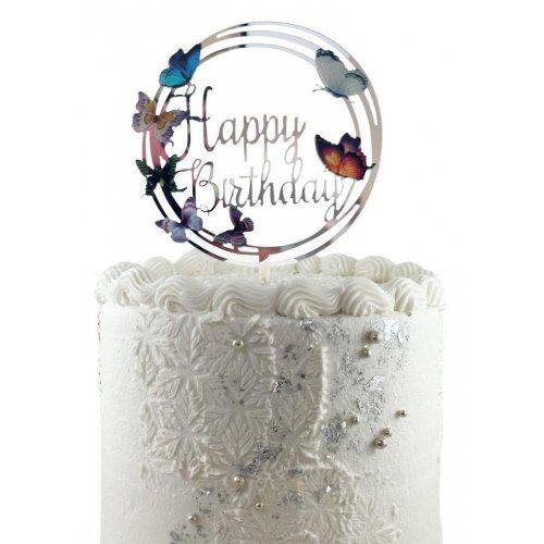 Measuring 12.5cm diameter, this topper features silver acrylic 'Happy Birthday' wording and circular frame with coloured butterflies.