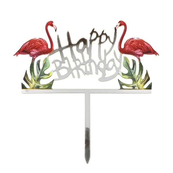 Measuring 14cm (w) x 7.2cm (h), this topper features silver acrylic 'Happy Birthday' wording with pink flamingos and green palm leaves.