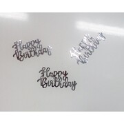 Metallic Silver 'Happy Birthday' script writing Jumbo confetti. Perfect for table scatters, Party favour, bonbonniere and gift tags, place setting messages and scrap booking. Individual Confetti message measures 8x4cm. 10 pieces per pack.