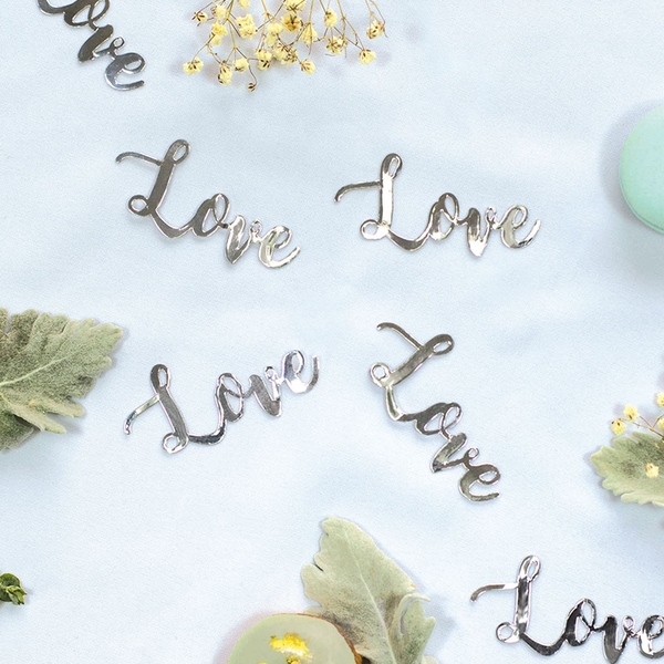 Metallic silver 'Love' script writing jumbo confetti. Perfect for table scatters, party favours, bonbonnieres and gift tags, place setting messages and scrap booking. Individual confetti messages measure approx. 7.5cm x 3.5cm. 20 pieces of confetti per pack.