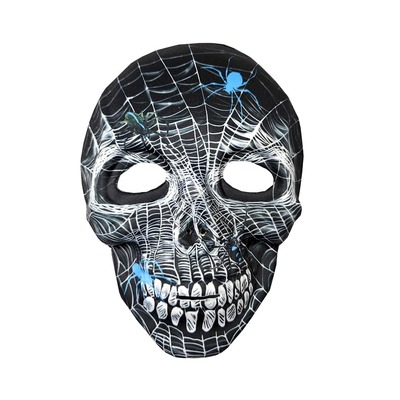 This mask is made from thin foam moulded in a contoured shull shape with a printed fabric overlay featuring teeth, cobwebs and creepy blue & black spiders. It has an elastic band around the head to keep it securely in place.