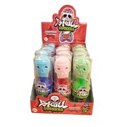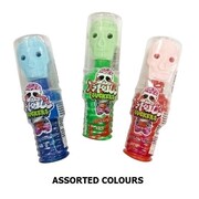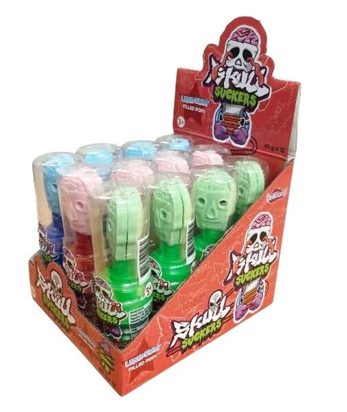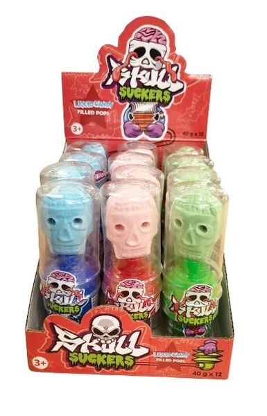 Each pack has a fruit flavoured skull shaped lollipop on tob of a 40g tub of sour liquid candy - simply push up from the bottom and watch the candy ooze out of the eyes....