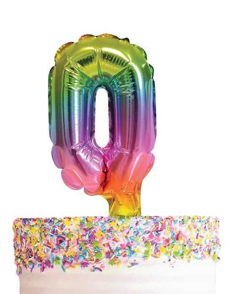 Rainbow number 0 balloon cake topper, perfect for putting on top of a birthday cake! Inflation instructions and stick (attached to balloon) included in pack. Stick measures approx. 6cm in length and balloon measures approx. 15cm in height (not including stick.)
