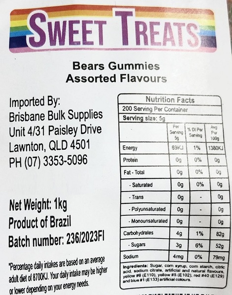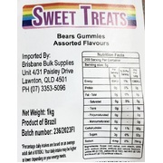These bear-shaped lollies have a firm texture and are coated in a layer of sour powder. Individual lollies measure approx. 3cm x 1.5cm