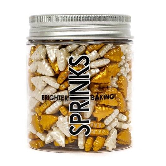 Perfect for adding a touch of magic to your holiday baking and your festive treats, this sprinkle mix features whimsical tree shapes and rich metallic colours.