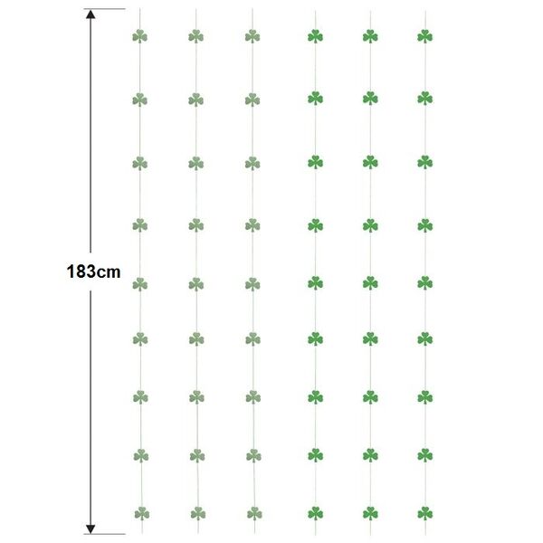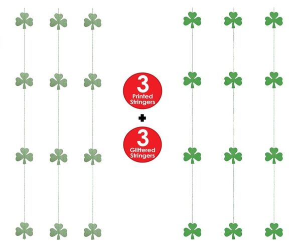 Each pack contains 6 decorations consisting of 5cm cardboard shamrocks on a 183cm string - 3 decorations have a glitter finish and 3 have a semi-gloss plain finish.