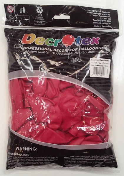 These standard fashion raspberry 30cm latex balloons are perfect for decorating a party area or putting in a balloon arrangement as a gift! With 100 balloons in a pack, these balloons are helium quality, meaning they can be filled with either helium or air. Balloons should look their best for 10-12 hours, if filled with helium, before coming down.