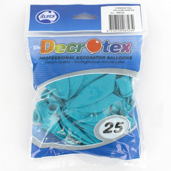 These standard 30cm teal latex balloons are perfect for decorating a party area or putting in a balloon arrangement as a gift! With 25 balloons in a pack, these balloons are helium quality, meaning they can be filled with either helium or air. Balloons should look their best for 10-12 hours, if filled with helium, before coming down.