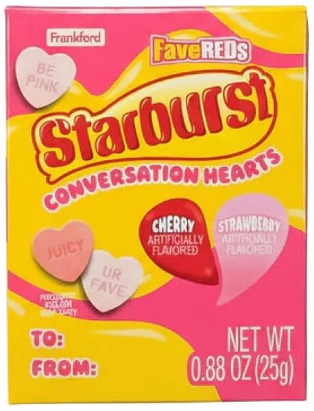 These soft chewy heart-shaped lollies feature fun conversational messages as well as delivering the juicy flavours Starburst are known for.