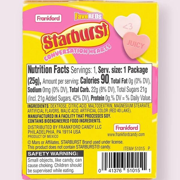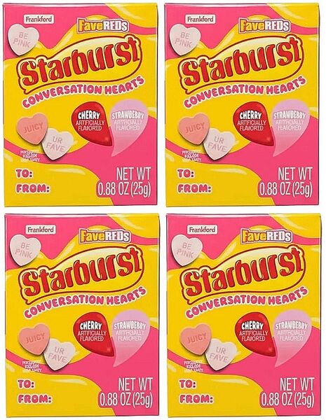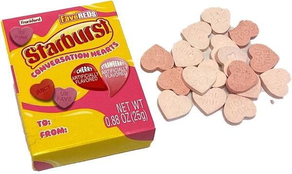 These soft chewy heart-shaped lollies feature fun conversational messages as well as delivering the juicy flavours Starburst are known for.