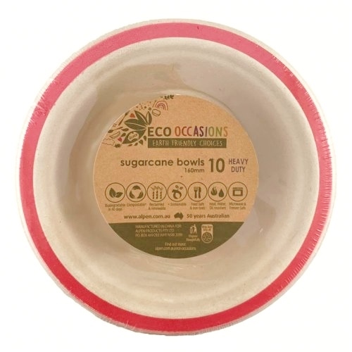 Pack of 10 heavy duty sugar cane disposable bowls, each measuring approx. 16cm in diameter and 3cm in depth.