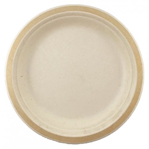 Pack of 10 heavy duty sugar cane disposable plates, each measuring approx. 22.5cm in diameter.