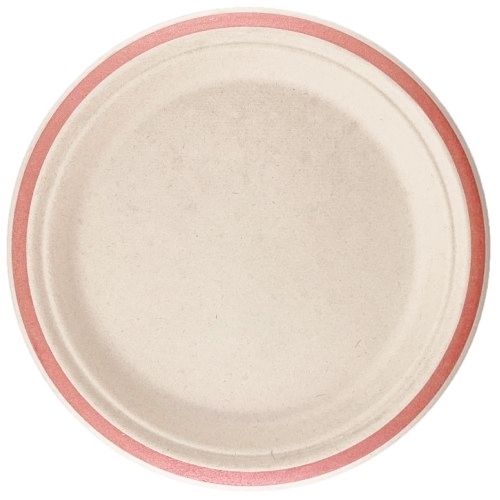 Pack of 10 heavy duty sugar cane disposable plates, each measuring approx. 22.5cm in diameter.