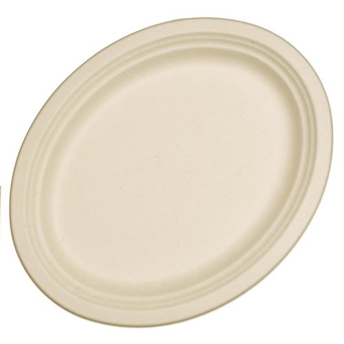 Pack of 10 heavy duty sugar cane disposable plates, each measuring approx. 25cm x 32cm.