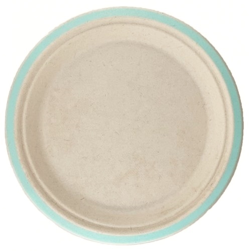 Pack of 10 heavy duty sugar cane disposable plates, each measuring approx. 18cm in diameter.