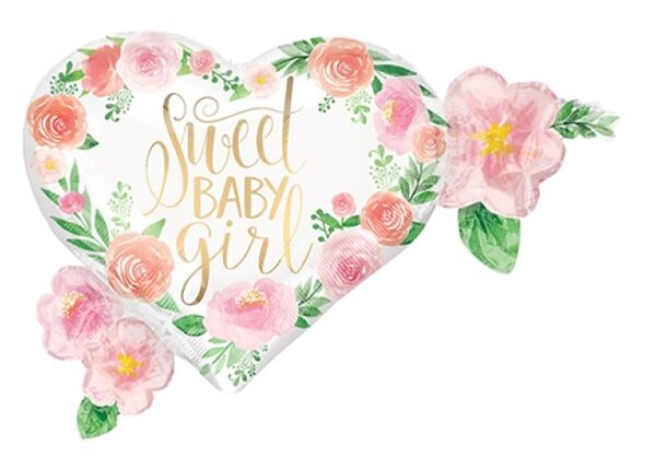 This fun heart shaped balloon features a 'Sweet Baby Girl' message with a lovely pastel floral pattern.