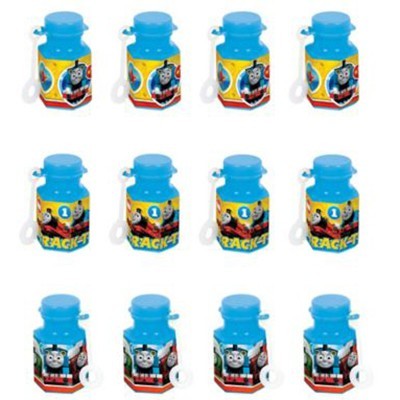 Pack of 12 Thomas themed mini bubble bottles, each measuring approx. 5cm in total height and with approx. 17ml of bubble liquid in each.