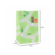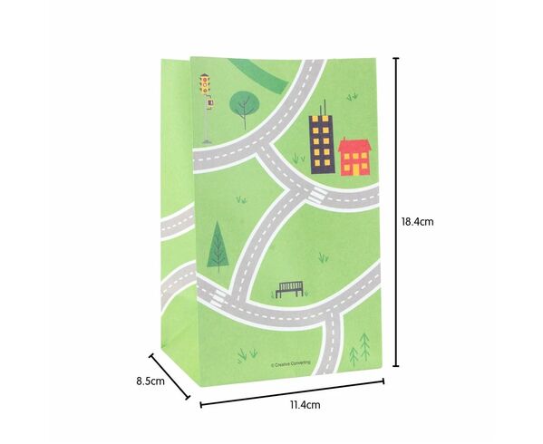 The pack contains 8 paper bags in 2 designs with landscape & road prints and 8 sticker sheets featuring transport vehicles such as cars, a bus, helicopter, submarine and trucks.