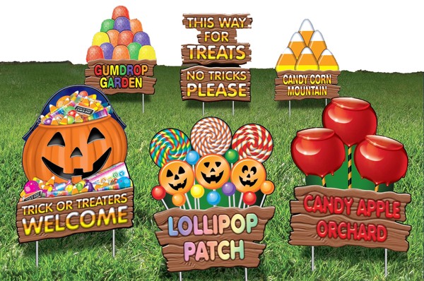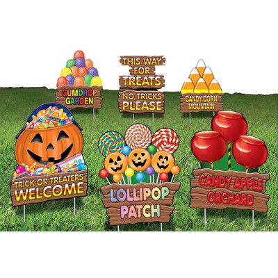 Pack of 6 cardboard yard signs in a trick or treat theme - perfect for any Halloween celebration! Each sign measures approx. 24cm x 30cm. 12 metal sticks (each measuring approx. 14cm in length) are included in the pack; these can be taped onto the back of the signs to stick them in the ground (tape not included.) Colours / designs may vary slightly from image.