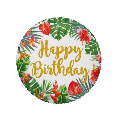 Hibiscus, frangipani, bird of paradise and anthurium blooms combine with palm leaves in this deligthful tropical design.