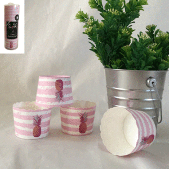 Pack of 25 troppo pineapple paper baking cups, perfect for any occasion! Cups measure approx. 5cm in diameter at the base, 4.5cm in height and 6cm in diameter at the opening.