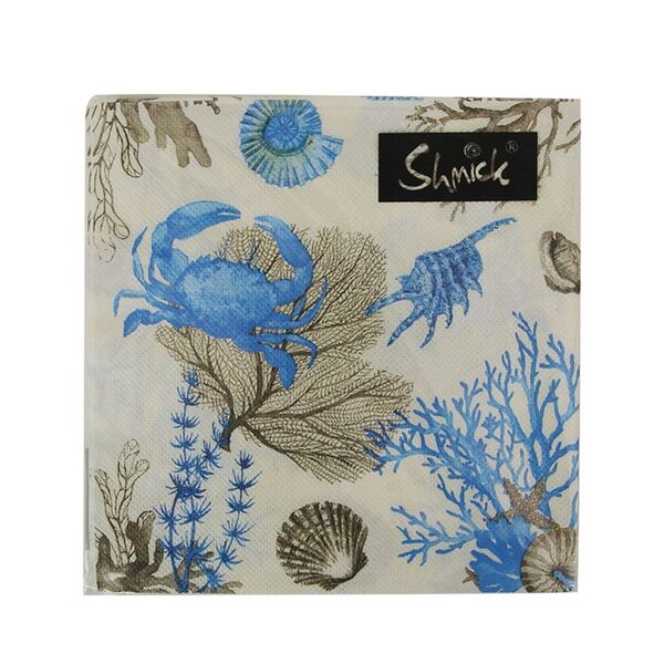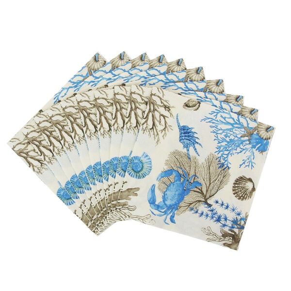 Your guests are sure to love the design of these napkins featuring a blue & brown crab, shell, coral & seaweed pattern on an ivory background.