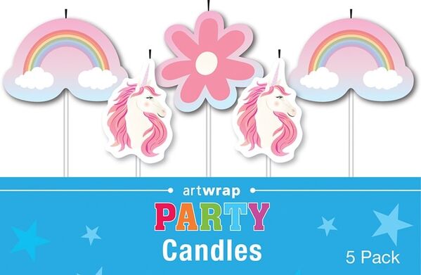 The pack contain 5 individual candles featuring unicorns, rainbows and a flower - perfect for your party.