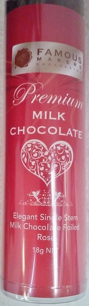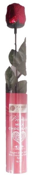 Milk chocolate rose in cylinder, measuring approx. 30cm in total length and weighing approx. 18g. Pack of 24.