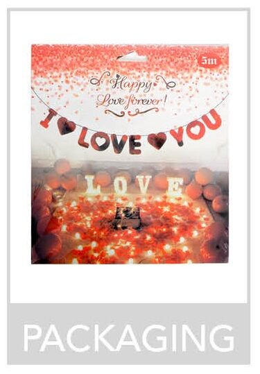 Perfect for Valentine's Day, weddings, engagements and just because, the banner features red foil letters spelling out I LOVE YOU with extra heart cutouts between the words.