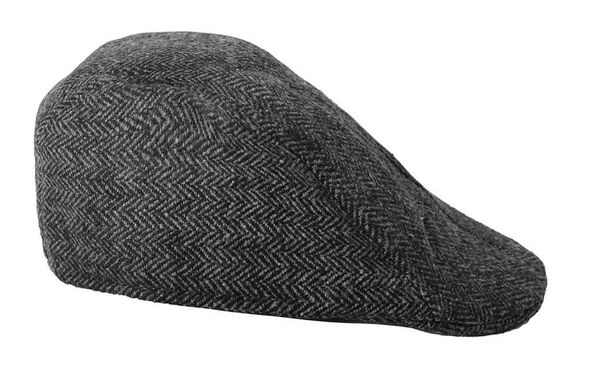 The hat is made in a classic one-piece flat cap style from dark grey cotton/polyester blend fabric.