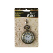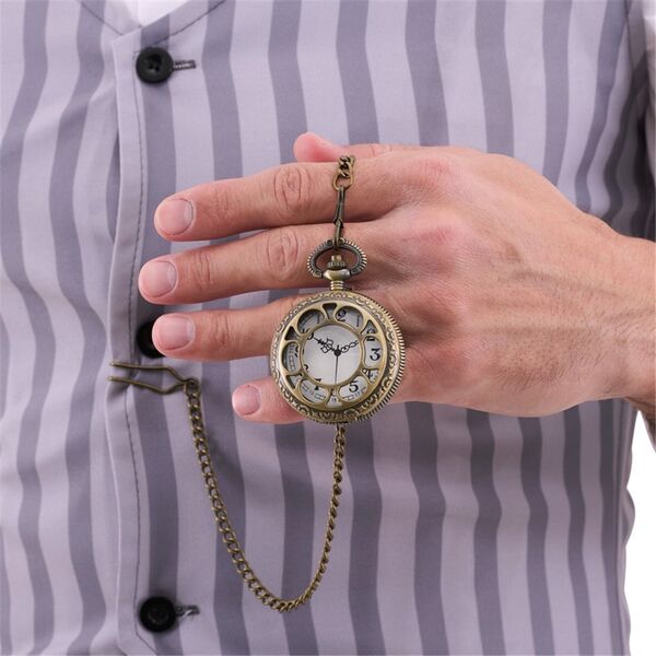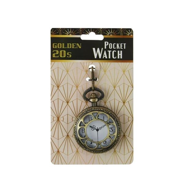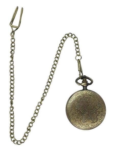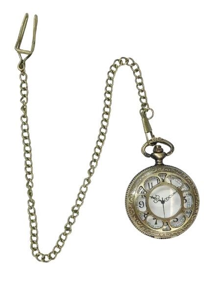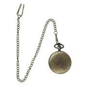 This classic pocket watch features a cut-out front that opens up, printed watch hands, intricate etched designs on the front & back and a 33cm chain with belt clip.