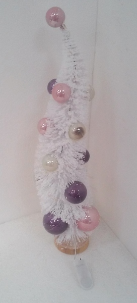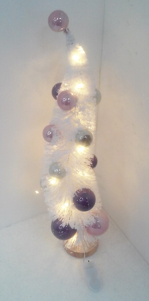 White Christmas tree decoration covered in fake snow, with assorted colour bauble attachments and lights - perfect for any Christmas celebration! Tree measures approx. 43cm in height and wooden base measures approx. 7cm in diameter. Batteries are included, however as they are supplied by the manufacturer for display purposes, we cannot guarantee their lifespan and they may need to be replaced soon after purchase.