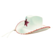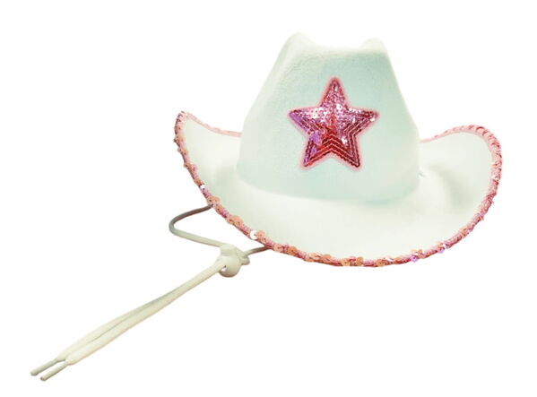 This hat is made from white moulded felt and features a pink sequin decal on the crown and matching trim around the edge of the brim.